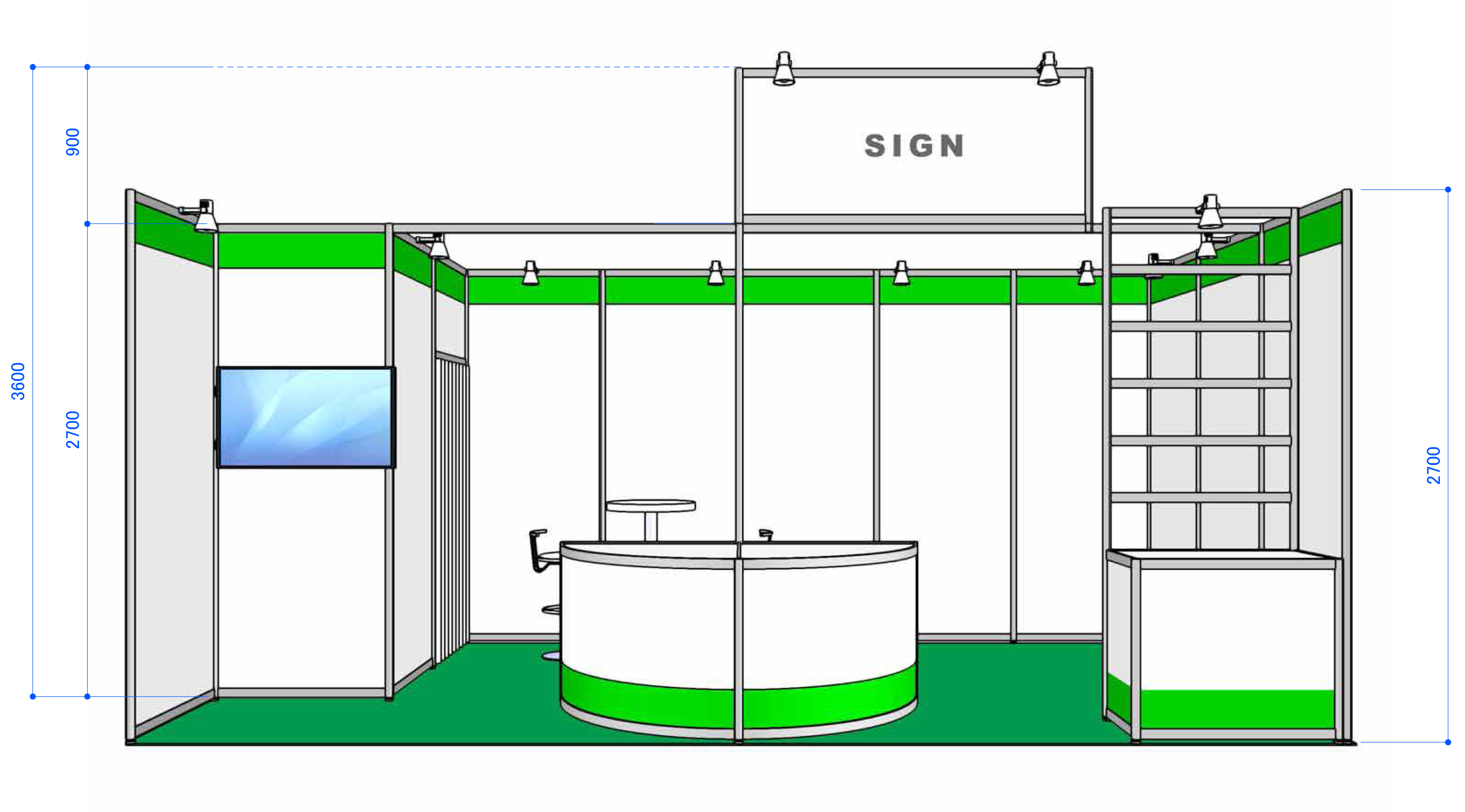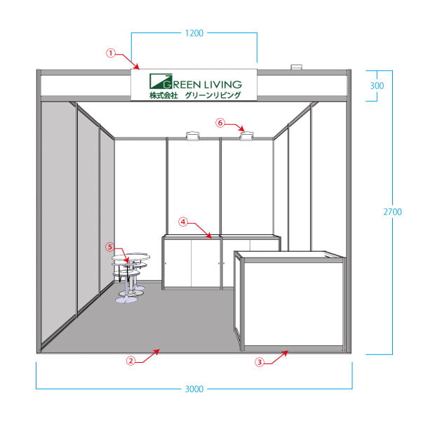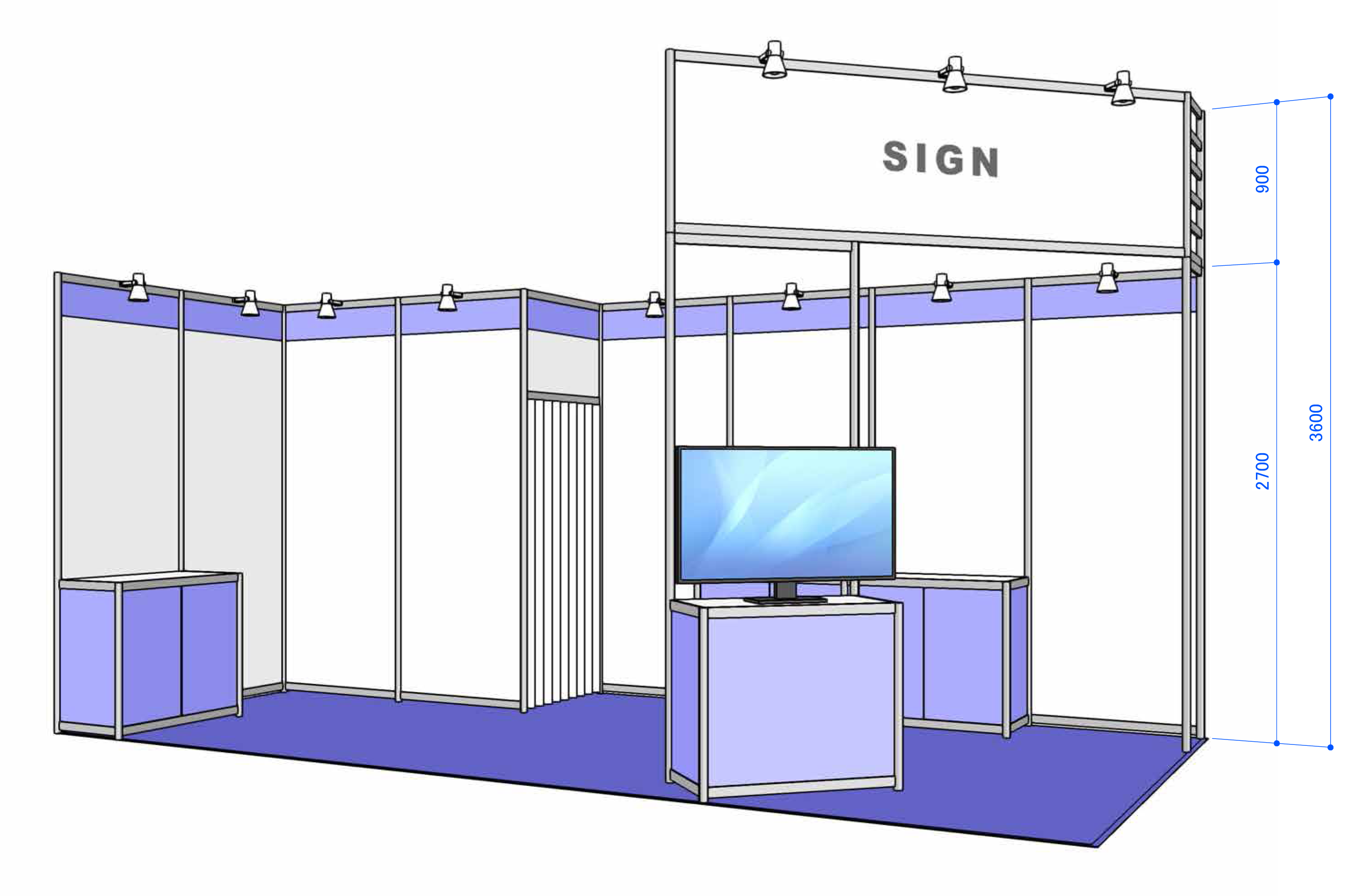 壁面パネル·社名看板·カーペット·電気工事(照明)·レンタル備品(受付台、展示台など)など、展示会に必要な物がセットになったブースの事を言います!