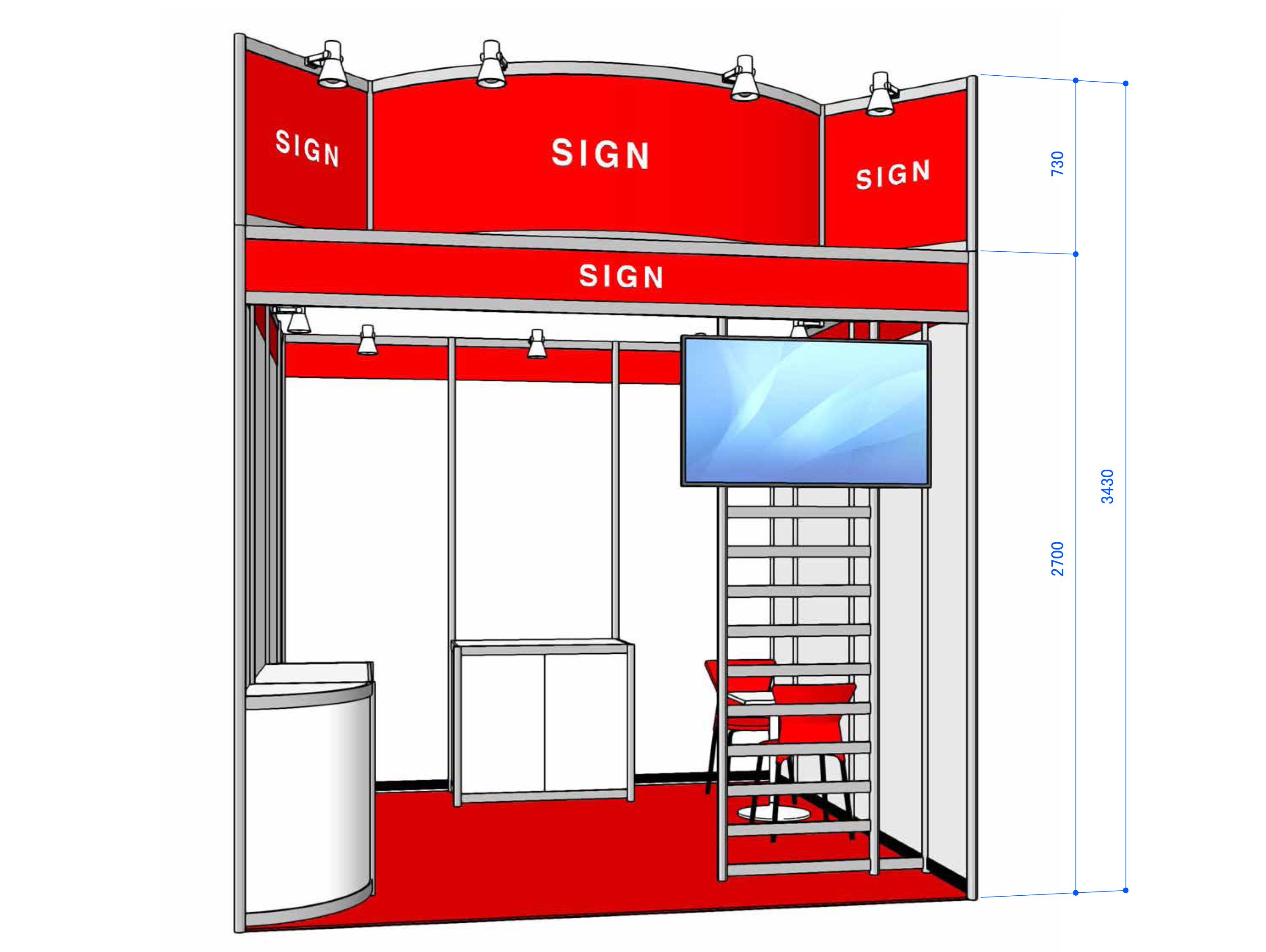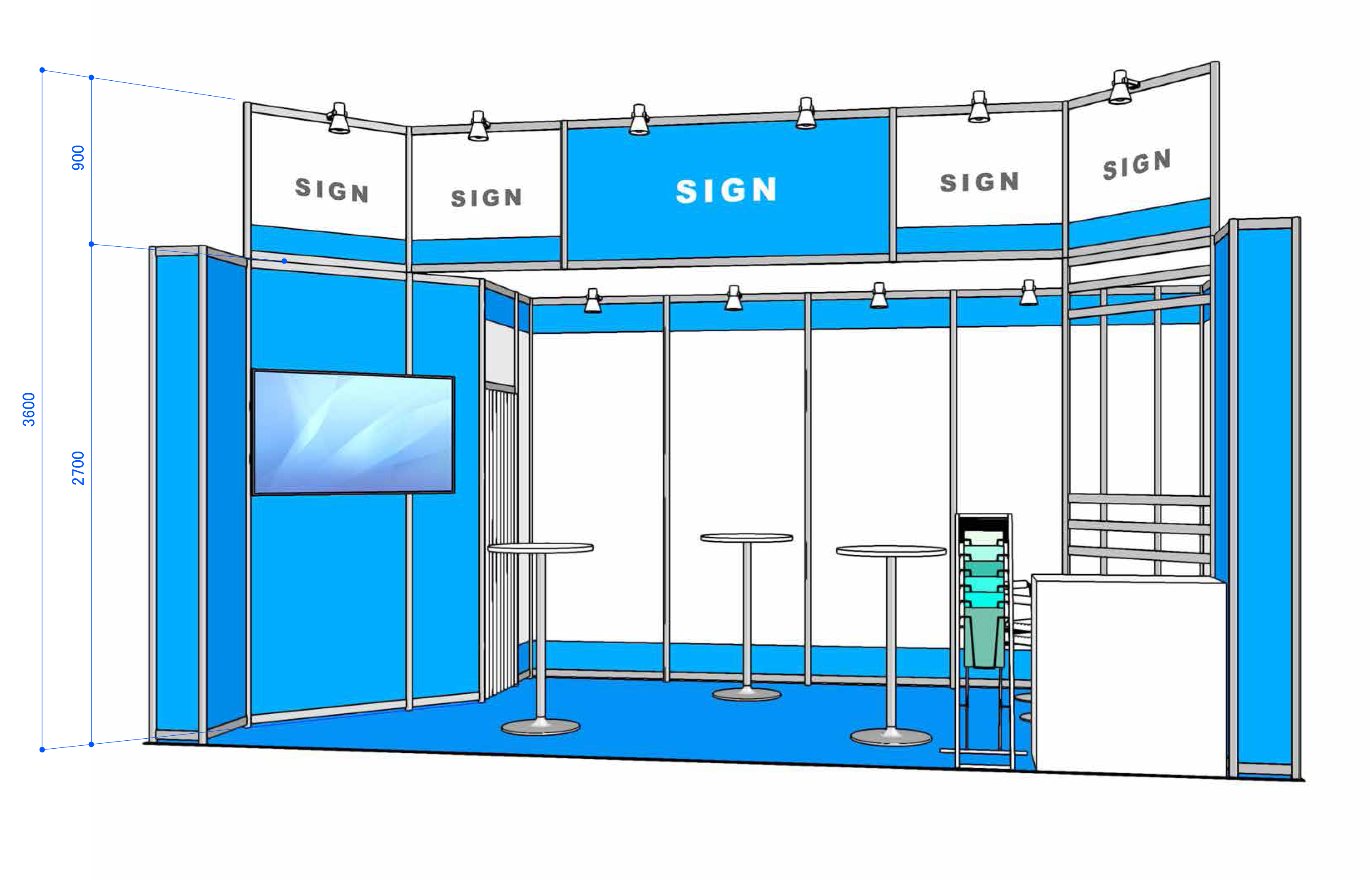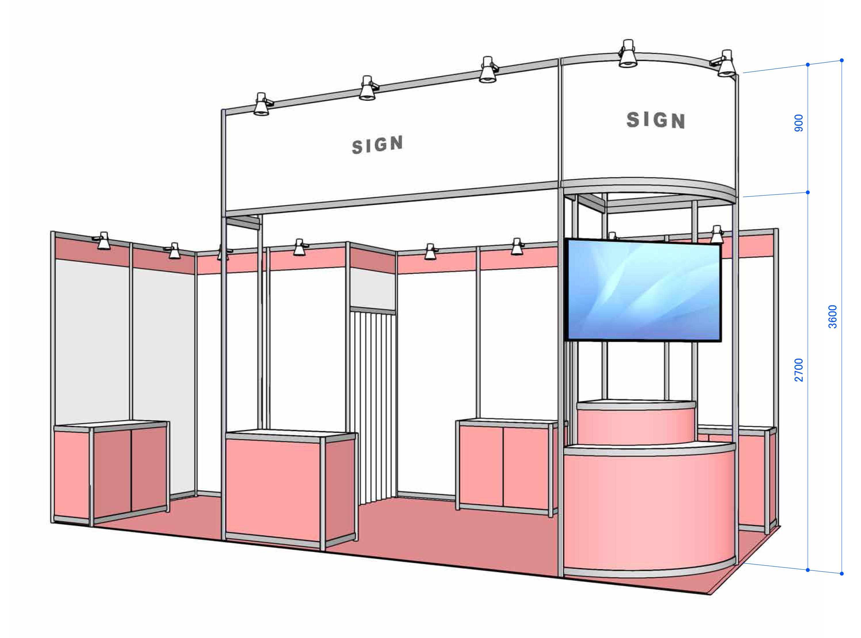 壁面パネル·社名看板·カーペット·電気工事(照明)·レンタル備品(受付台、展示台など)など、展示会に必要な物がセットになったブースの事を言います!