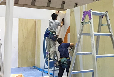 何回かの打合せを行った内容に基づいた設計図を作成し、展示会開催日の約2週間前を目安に造作物の事前制作、各種必要備品や設備(電気・カーペット等)の手配を進めて行きます。設営日においても徹底した安全管理体制を行い、集客・アピール力の高い展示を構成するため、機能的な集団が理想の空間演出を作り上げます!また、開催当日の追加・変更のご要望にも常に迅速にご対応できる体制を常に整えております!